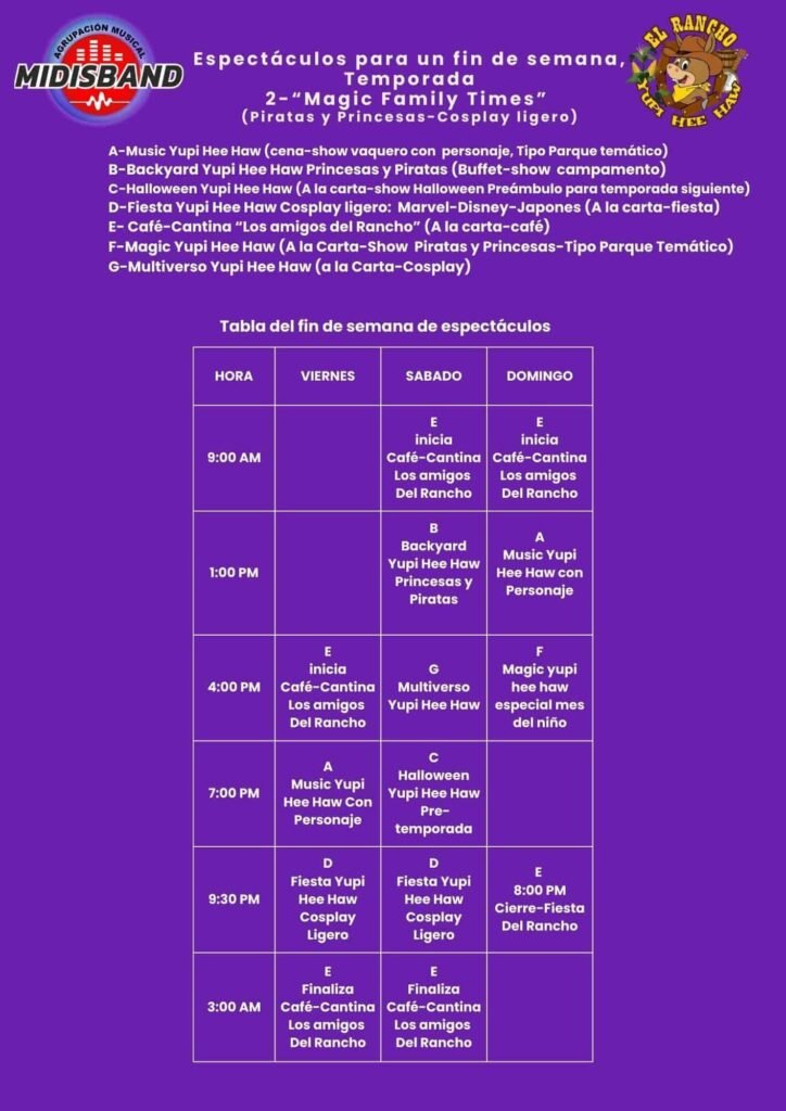 Con la llegada de julio comienza la mágica Temporada Magic, llena de fantasía y diversión para niños de todas las edades. El rancho se transforma con un ambiente inspirado en cuentos de hadas y aventuras legendarias. Tendremos espectáculos con princesas Disney, valientes héroes fantásticos, coloridos piratas y actividades de cosplay ligero. Cada día en Magic es una invitación a volver a ser niño, con encuentros inolvidables junto a tus personajes favoritos y juegos interactivos cargados de emoción.